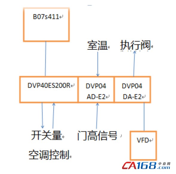 方案的具体实现方式为:由台达PLCDVP04AD-E2采集各个通风柜的门高数据(0-10V);通过台达PLCDVP40ES200R计算出每个通风柜的通风量和执行阀需要打开的角度;DVP04DA-E2输出电压信号,控制执行阀的角度,保证每个通风柜的通风量恒定,并且根据总的要求风量,控制变频器运行速度。根据采集到的室内温度,控制空调的制热、制冷,实现温度恒定。具体的架构如下图: