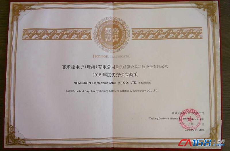 赛米控中国很荣幸地宣布获得分别由北京天诚同创电气有限公司(下称“天诚同创”)和新疆金风科技股份有限公司(下称“金风”)所颁发的“ 2015年度优秀供应商”两个奖项。