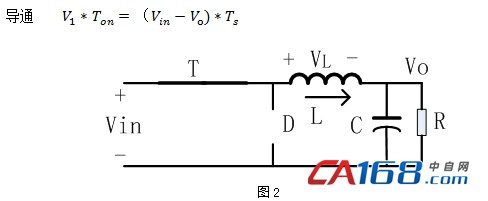 当PWM驱动高电平使得NMOS管T导通的时候,忽略MOS管的导通压降,等效如图2,电感电流呈线性上升,MOS导通时电感正向伏秒为: