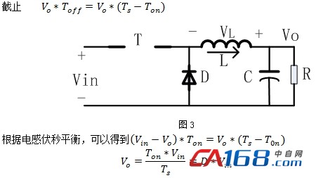 当PWM驱动低电平的时候,MOS管截止,电感电流不能突变,经过续流二极管形成回路(忽略二极管电压),给输出负载供电,此时电感电流下降,如下图3所示,MOS截止时电感反向伏秒为: