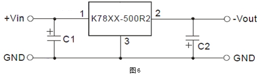 从上面Buck电路以及Buck-Boost电路结构原理来看,主要的区别是两者二极管与功率电感的位置互换。因此,若将Buck电路的输出Vo引脚接成输入的GND,而之前的输入GND就变成了负电压输出了,即变成了Buck-Boost的电路结构。对应到金升阳K78xx-500R2系列的产品就变成了如下图6所示的负输出。
