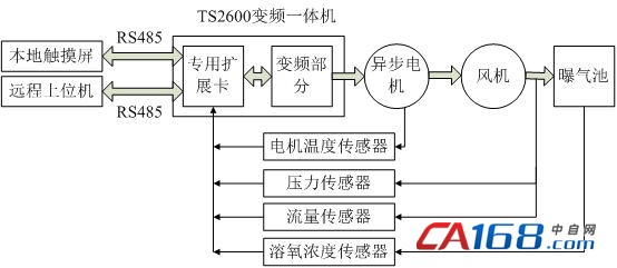 针对污水处理中曝气风机的工艺要求,采用TS2600系列变频一体机,搭配专门为曝气风机研发的扩展卡,使用触摸屏作为人机界面,设计了如下的应用方案: