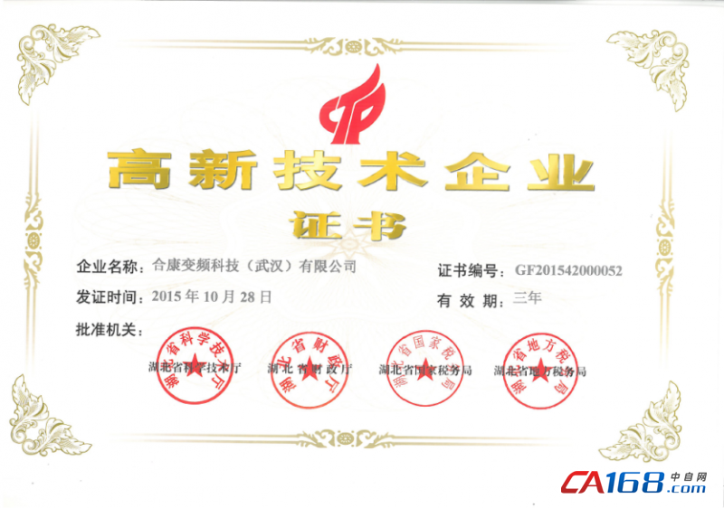 近日,合康变频科技(武汉)有限公司收到湖北省科学技术厅、湖北省财政厅、湖北省国家税务局、湖北省地方税务局联合下发的高新技术企业证书(证书编号:GF201542000052;发证日期:二〇一五年十月二十八日;有效期:三年。) 此次证书是继2012年我司首次被认定为国家“高新技术企业”后的换证复审。