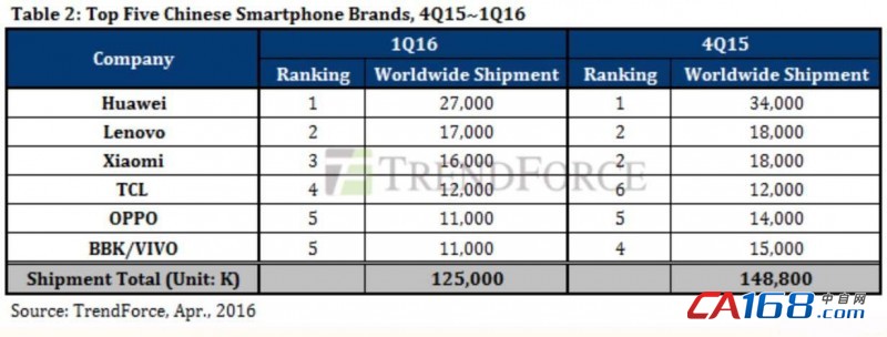TrendForce智能手机分析师吴雅婷表示,2016年第一季中国品牌(含外销)智能手机总出货量首度超越三星与苹果的加总,高达1.25亿部,占全球比例42.9%,与上季度的41.5%相比,比重持续升高。即使处于市场淡季,但在中国内地有营运商加强补贴4G机型及积极拓展海外市场两大因素驱动下,中国品牌智能手机出货仅季衰退16%,幅度明显小于全球其他品牌,国际品牌大厂生存空间将进一步受到挤压。但由于海外市场竞争更趋激烈,中国品牌智能手机厂商的获利率仍有持续下滑压力。