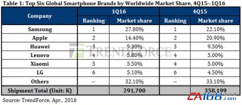 全球市场研究机构TrendFroce最新报告显示,2016年第一季全球智能手机出货约2.92亿部,环比衰退18.6%,同比则衰退1.3%。主要原因在于智能手机市场趋近饱和,位于领先地位的三星与苹果增长动能不再,整体出货量只能依赖中国品牌在印度等新兴市场提升。