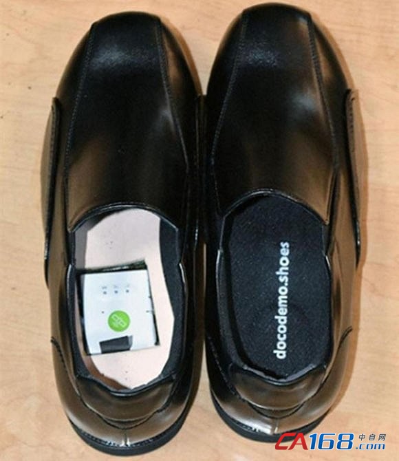 如图所示,皮鞋左脚脚跟处内置了采用手机网络的小型GPS芯片,可以通过智能手机或电脑进行定位。共享专用网站的ID和密码后,家人、熟人及看护人员就可追踪到位置信息。
