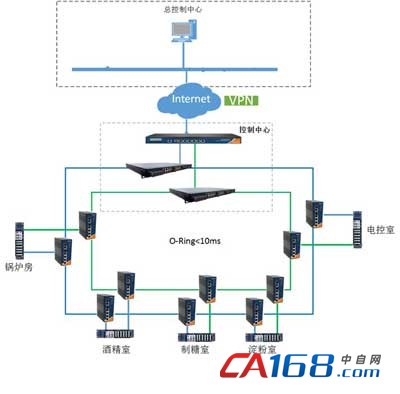 这套自动化控制系统需要监控生产线上的各个环节,包括锅炉房、电控室、酒精室等。一条生产线上的每个操作工序都有一台PLC,系统需要组建一个工业冗余网络,将PLC的数据通过网络传输至控制室,从而便于工作人员可以在控制中心随时查看并了解生产线上设备的实时状态。