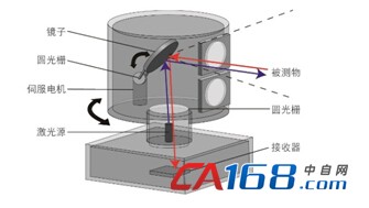 光栅在扫描仪上主要应用于测角部分,用以反馈每个发出的脉冲在扫描仪坐标系下的角度,再与测距数据组合进行计算。 典型扫描仪一般设计共有平行和垂直两个旋转轴,两轴均采用伺服电机,分别配置圆光栅系统作位置反馈,激光源通过两组以伺服电机带动且匀速旋转的棱镜,并以固定的脉冲发射间隔发射到被测物体进行扫描,从而收集三维空间数据。光栅在整个系统中的作用可说是至关重要,如果反馈角度数据偏差,对应的角度值就会出现错误,从而导致系统生成扭曲的图像。目前市场上的车载扫描仪最大测距范围可达道路两旁1000 m或以上,测角的分辨率和精度普遍也能达到0.001度和0.005度,另外测距精度可达每100 m误差仅 10 mm以内。”
