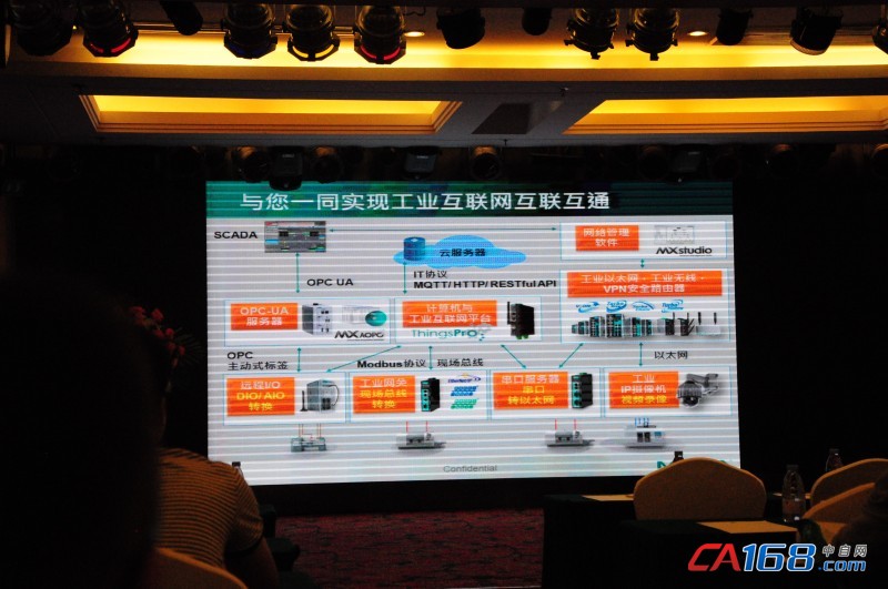 在石壁渊先生之后,Moxa的产品经理们依次为我们介绍了公司在连接设备层和应用层之间的一系产品,讲演简明而清晰介绍了Moxa产品架构。Moxa为了实现设备层和应用层的连接,推出了三部分产品,依次是边缘网络产品、工业计算机和网络基础设备。