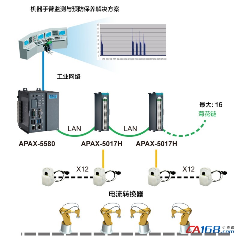 研华以APAX-5000系列PAC控制器搭配模拟量输入模块与分布式工业以太网总线所规划出的机器手臂监测与预防保养解决方案,可满足该面板制造企业高速采集数据的需求。其中,所选的研华APAX-5580控制器曾在第十四届中国自动化年度评选中斩获“2016年中国自动化创新产品奖”,内建Intel处理器的APAX-5580不但是一台可提供高效运算的工业计算机,也是一款可灵活整合各种I/O模块的控制平台。此外,通过12通道模拟量输入模块APAX-5017H来连接六轴机器手臂上的传感器(Current Transformer),APAX-5580可以将APAX-5017H模块收集的模拟量信号暂存于内部硬盘内,而中控室的监测系统则可通过工厂内部网络和用户设定的时间(每隔五分钟或每隔十分钟)定时收集工业计算机内的数据,以利用详细的电流变化分析机械手臂是否存在异常。
