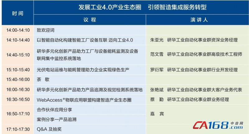 本次会议我们将与您深入探讨工业4.0及工业互联网+时代下中国制造产业生态圈、解析研华WebAccess+物联应用联盟伙伴营销平台、分享智能制造行业典型应用,以期推进智能制造服务转型。 我们竭诚欢迎各位业界先进和合作伙伴参与此次盛会,与研华偕行,创造更多的商业合作机会,一步一个脚印的迈出属于我们自己的2025。 会务信息:http://www2.advantech.com/EDM/EE84243C-B82A-41E0-9188-C8B8C5AB7C0D/index.html 如需了解更多信息可访问研华官方网站:www.advantech.com.cn 关注研华科技官方微博,掌握最新技术动态及资讯: http://t.sina.com.cn/advantechchina 关于研华 –研华科技创立于1983年,是先进、可信赖的创新型嵌入式、自动化产品解决方案提供商,提供包括完整的系统集成、硬件、软件、以客户为中心的设计服务和全球物流支持等。研华同时也是Intel嵌入式与通讯联盟 (Embedded & Communications Alliance) Premier Member,通过与解决方案伙伴的密切合作,为各种工业应用提供完整的解决方案。研华拥有6000多名专职员工,在20个国家、91个主要城市之间形成了一个广泛的技术支持和营销网络,因此可以为全球客户提供快速的上市服务。更多信息,请查询www.advantech.com.cn