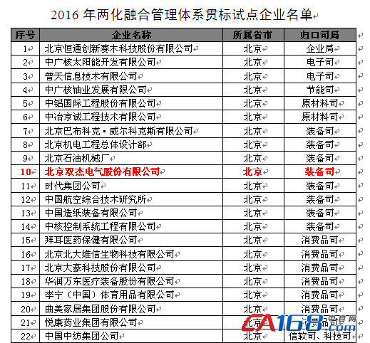 日前,工信部发布了《关于公布2016年两化融合管理体系贯标试点企业名单的通知》(工信厅信软函〔2016〕359号)。北京市共有22家企业评选为两化融合管理体系贯标试点企业(详见附表)。北京双杰电气股份有限公司(下文简称:双杰电气,股票代码:300444)作为民族电力设备制造企业榜上有名,顺利通过两化融合管理体系贯标试点企业评定,成为全国两化融合管理体系贯标试点评定企业之一。