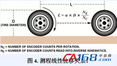 测程反馈系统利用光学编码器对驱动和转向轴旋转的测量结 果来估算机器人的位置、驶向和速度。在光学编码器中,用一 个碟片阻挡内部光源,或者通过数千个微小窗口让光源照射在 光传感器上。碟片旋转时,便会产生一系列电脉冲,这些脉冲通常被馈入计数器电路。每旋转一圈的计数次数等于碟片内的 槽孔数目,因此可从编码器电路的脉冲计数计算旋转数(包括小数)。图4提供了将驱动轴旋转计数转换成线性位移(位置)变化的图形参考和关系。