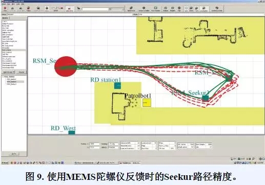 仓库自动化系统目前使用叉车和传送带系统移动材料,以管理 库存并满足需求。叉车需要直接人为控制,而传送带系统则需 要定期维护。为了最大化仓库价值,许多仓库正在进行重新配 置,从而为自主机器人平台的应用敞开了大门。一组机器人仅 需要更改软件、对机器人导航系统进行再培训就能适应新任务,完全不需要实施大量工程作业来改造叉车和传送带系统。仓库 交货系统中的关键性能要求是机器人必须能够保持行程模式的 一致性,可在有障碍物移动的动态环境下安全执行机动动作, 并且保证人员安全。为了说明在此类应用中MEMS陀螺仪反馈 对Seekur的价值,Adept MobileRobots用实验方式分别展示了在不使用(图 8)和使用(图 9)MEMS陀螺仪反馈的情况下,Seekur保持重复路径的能力。应注意,为了研究MEMS陀螺仪反馈的影响,该实验未采用GPS或激光扫描校正。