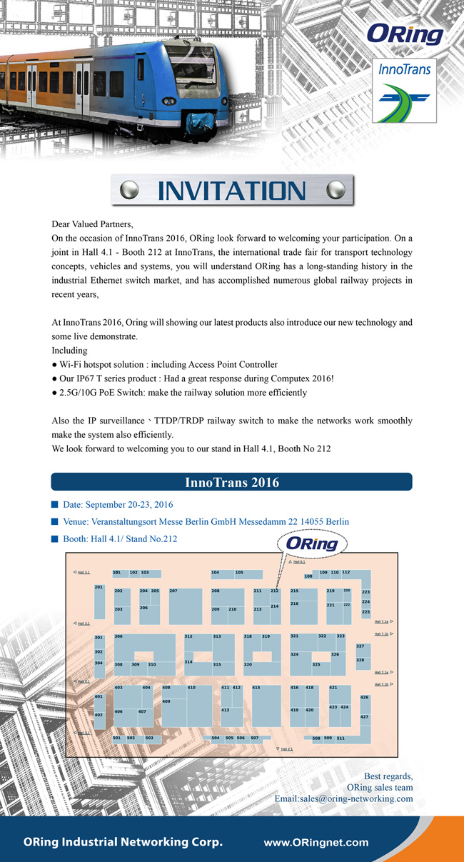 此次ORing将在InnoTrans上采用动静态演示的方式全面展示ORing轨道交通完整解决方案,包括: