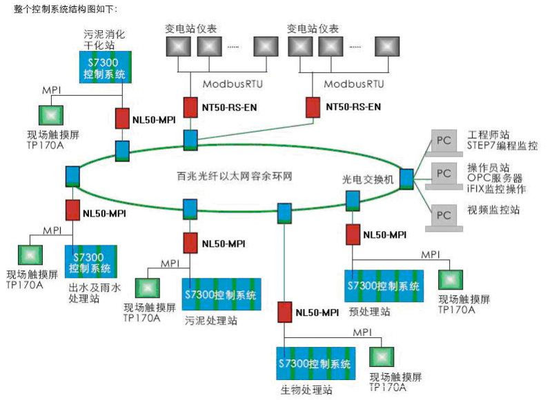 本论文所基于的某污水处理工程项目,项目自动控制部分主要包括:预处理站、生物处理站、污泥处理站、出水及雨水处理站和污泥消化干化站五个站点的控制系统。控制系统均采用Siemens S7-300作为CPU负责每个站点的分散控制,利用德国赫优讯netLINK将S7-300 PLC连接至以太网,通过带光纤接口的交换机,采用以太网冗余光纤环网构架,实现高速通讯的网络数据传输,从而将现场设备的数据传至总控室,总控室上位计算机操作员站运行iFIX监控软件,通过Kepware公司的netLINK OPC Server,利用OPC方式,实现S7-300控制系统实时数据的读写,同时,工程师站也可通过STEP7软件对所有S7-300站点CPU进行编程下载,所有操作均可在总控室中完成。从而实现真正意义上的工厂信息化联网总控。