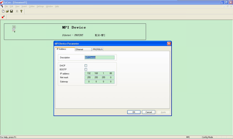 德国赫优讯netLINK网关的参数配置非常简单方便,利用随netLINK带的光盘,安装免费软件SyCon,运行软件,新建工程,插入一个NL 50-MPI设备,选择TCP/IP驱动,通过内置软件NetIdent进行网络netLINK设备的搜索,选择网络上需要配置的netLINK,进行参数配置,参数配置如图3所示,首先需要对IP地址进行配置,注意IP地址需要和运行计算机的IP地址处于同一网段中,否则无法连接硬件。Ethernet参数默认即可,PROFIBUS参数一般情况下默认即可,有时需要根据实际情况对MPI地址进行重设,默认为2。参数配置完成后,通过Online---Download下载设备参数信息至netLINK Flash中,永久保存。