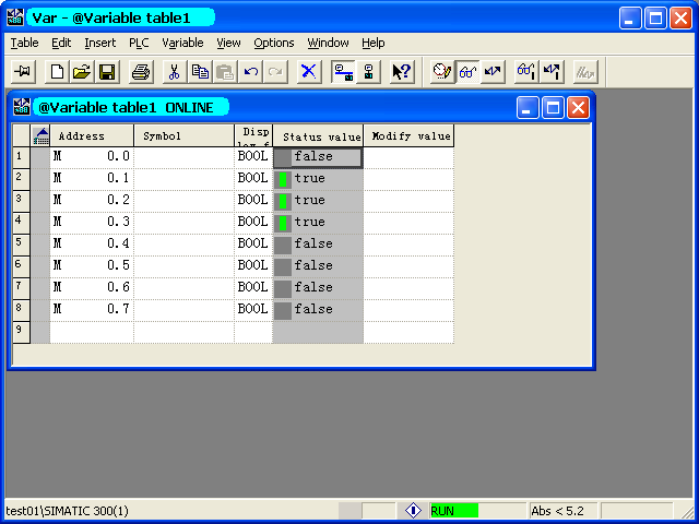 打开STEP 7软件,选择PLC---Monitor/Modify Variables,设定测试参数,单击“Monitor Values”, 查看地址状态,如图7所示,M区地址可被读写控制,说明数据传输状态良好,通讯连接正常,说明netLINK通过IBH驱动,可实现STEP7与S7-300的通讯,同时可通过PLC---Download,对编辑程序进行远程下载,工程师可在总控室内,通过netLINK,选定IP地址,利用以太网对远程指定CPU进行程序下载操作。