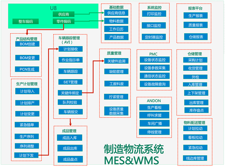 制造物流系统项目上线后还与U8、DMS、SRM等系统进行了集成,共同构成了北汽新能源信息系统项目群,各系统业务范围与数据交换如下图所示: