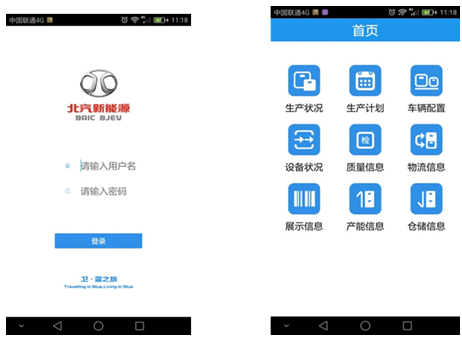 此外,系统上线后,项目组针对需求为北汽新能源开发的手机APP报表也于5月初成功上线,使得北汽新能源中高层管理人员可以方便地了解企业计划、生产、物流、成品、质量等业务运行情况和宏观指标数据,方便领导实时掌握现场情况,发生异常情况时可以第一时间进行处理,得到了客户地一致好评,是项目的一大亮点。以下是移动APP系统截图: