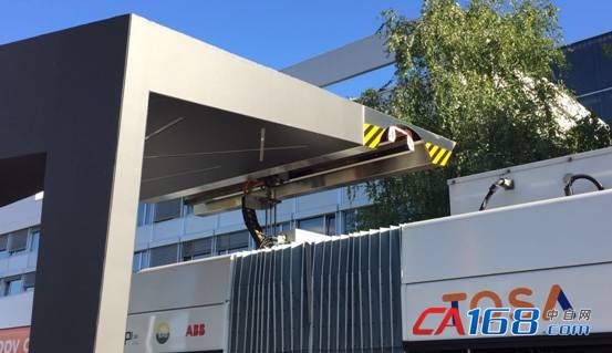 车停稳后,车顶迅速升起一根可伸缩机械臂,车棚下方通过激光传感器控制的移动臂与之精准对接。ABB瑞士轨道交通与城市交通全球产品专家布鲁斯•华纳(BruceWarner)告诉我们,“这辆公交车开始充电了。”