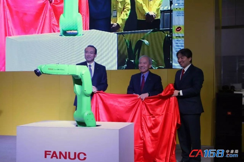 发布会上,发那科株式会社会长稻叶善治、发那科株式会社社长山口贤治、发那科株式会社董事、专务执行役员兼机器人事业本部本部长稻叶清典共同为CR-7iA揭幕。