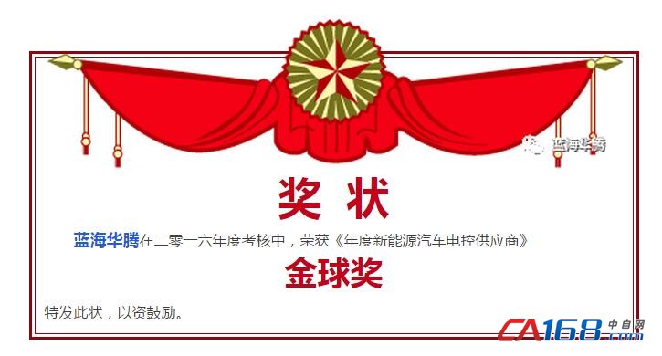 近日,蓝海华腾前线捷报不断。就在2016年12月9日晚,深圳·沙井维纳斯皇家酒店隆重举行的2016高工锂电电动车金球奖颁奖盛典中,蓝海华腾从55家初选企业,经过为期15天的网络投票,入围到12家候选企业,再经行业专家现场评选投票,一路披荆斩棘,最终在评选中脱颖而出,一举夺得电动车“年度电控供应商”金球奖。