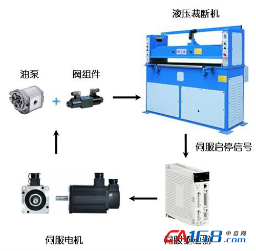 液压裁断机是一种借助机器运动的作用力加压于刀模上,从而对材料进行切割加工的设备。其主要应用于皮革、橡胶、塑胶材料、纸板、纺织物、包装材料、玻璃纤维、软木等非金属材料的冲切裁断。传统液压裁断机的液压系统主要是通过异步电机带动油泵转动,同时利用飞轮进行储能,然后通过集成块(阀组合)实现方向、压力、流量调节,从而控制裁断机构的下降、裁切、上升及工作速度的快慢。在工作过程中,由于油泵电机一直处于运转状态,所以在每次裁切完成后的送料间歇期存在巨大的电能损耗。近日,四方CA100伺服系统成功应用于东莞某裁断机制造企业的液压裁断机上,新系统大幅降低了设备能耗,运行更加平稳可靠。