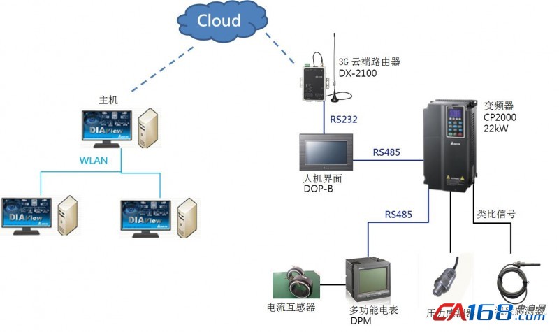 在系统控制上,台达空压机工业物联网解决方案采用内建PLC功能的风机水泵专用矢量控制变频器CP2000系列搭配温度和压力传感器控制空压机运行,以及多功能电表DPM系列和电流互感器监测电流信息。这些数据信息通过3G云端路由器上传至云端。最后由DIAView从云端读取信息,实时显示于画面上供管理者查阅。管理者可依据DIAView所撷取到的信息,调整空压机运行状态。