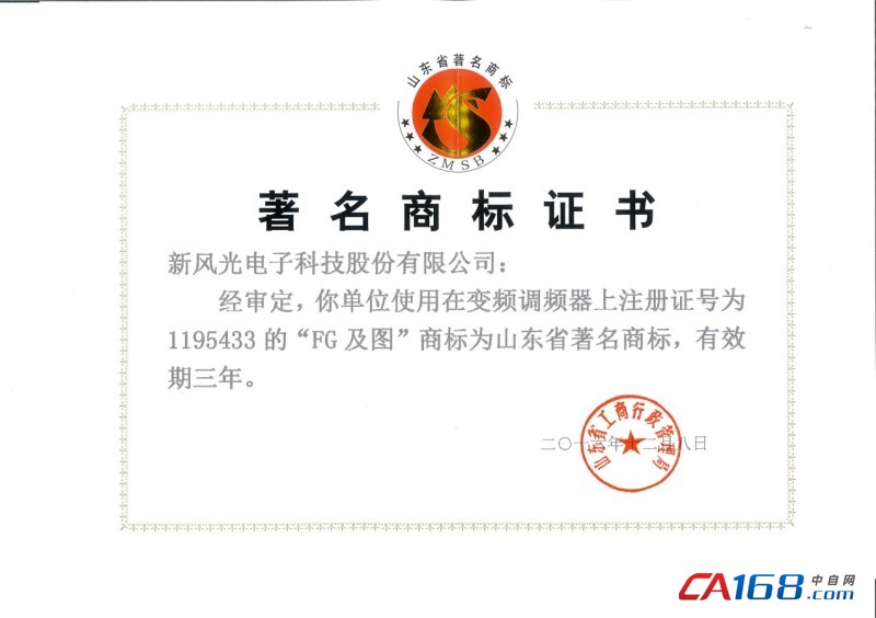 日前,新风光电子科技股份有限公司收到山东省著名商标证书,由新风光公司注册的“FG”商标顺利通过省工商行政管理局复审,再次被认定为山东省著名商标。