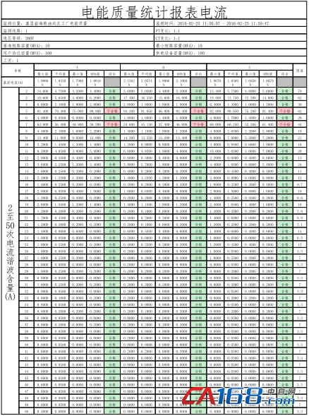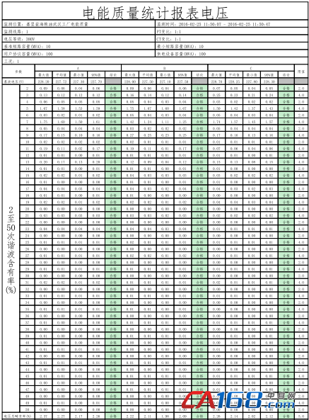 通过福禄克公司专用报表软件得出,电压谐波报表如下:电压总畸变率2.2%,符合国标规定的5%,功率因数0.97,这项指标良好,并且客户告知供电局也会有针对性的奖励。