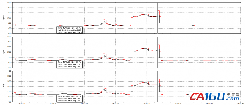 测试结果:经过Fluke 435II电能质量分析仪测试发现,舒乐冲压机的最大工作电流为3240A,远远高出额定工作电流1700A,其中2000A以上持续时间为5s以上。