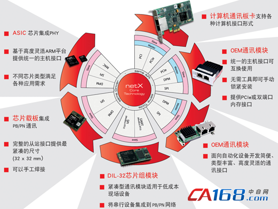 作为全球工业通讯领域的专家,德国赫优讯(HILSCHER)自动化系统有限公司一直注重各种现场总线和实时工业以太网协议堆栈的自主开发。基于赫优讯完全自主知识产权的网络控制器netX芯片,在EtherCAT协议接口方案上,赫优讯已经推出了不同类型的产品,实时以太网分析套件RTE Kit(EtherCAT网络协议的分析)、协议转换网关netTAP(不同通讯网络之间的数据互联)、计算机板卡cifX(基于PC技术的控制器平台方案)、嵌入式模块comX(嵌入式网络接口方案)、芯片组netRAPID(嵌入式协议转换接口方案)和netX100/51/52芯片(最底层EtherCAT网络接口方案)。