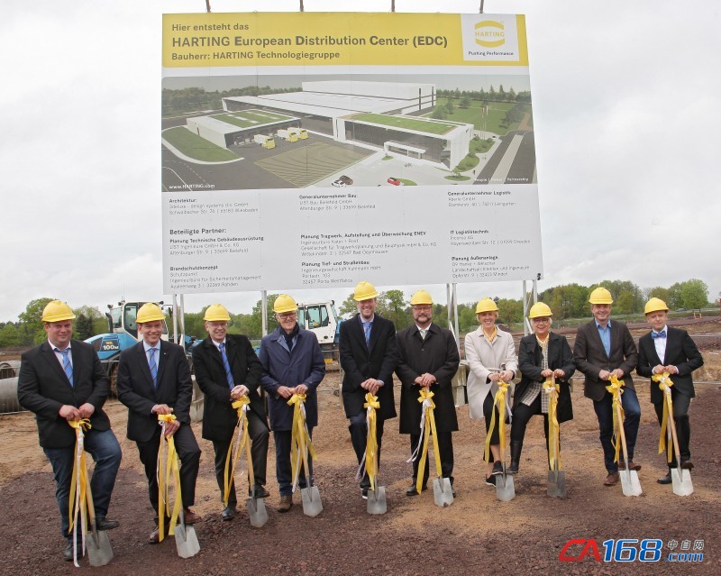 动土仪式文字说明:浩亭物流工作委员会主席Mario Lange、高级运营副总裁Andreas Conrad; 人力资源、工厂及法律事务总监Michael Pütz博士; 董事会成员洪狄马Dietmar Harting;浩亭技术集团董事会主席洪斐立Philip Harting;埃斯珀尔坎普市长Heinrich Vieker; 财务及采购委员会成员韩洪马莎 Maresa Harting-Hertz;合伙人洪玛嘉Margrit Harting; LIST Bau Bielefeld GmbH执行合伙人Jens Grünert以及浩亭物流总经理Achim Meyer在正式动土仪式上伸手(从左到右)。