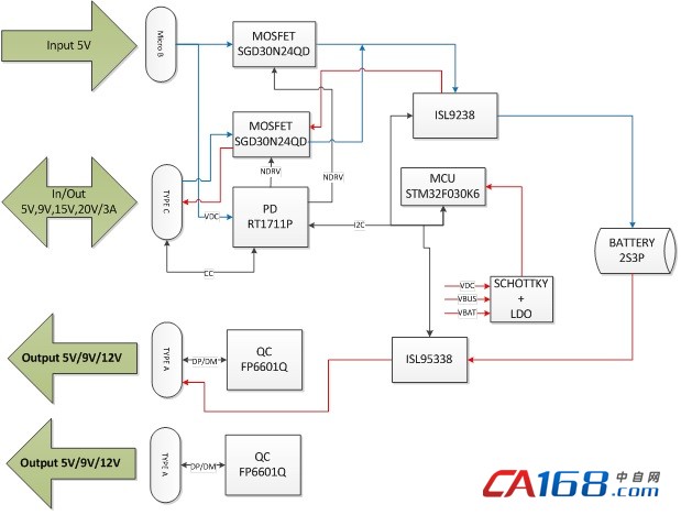 其中的ISL9238为英特矽尔(Intersil)的双向升降压控制IC,在目前该方案中主要应用于TYPE-C双向电源的供应及电池的充电。ISL95338则在目前该方案中起到TYPE-A电源的升降压的作用。