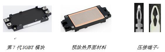 第7代IGBT模块,可以应用在通用变频器、伺服驱动器、不间断电源及新能源发电。它采用了第7代IGBT硅片和RFC二极管硅片,降低损耗;具有650V、1200V和1700V三种电压等级;涵盖模块电流35A至1000A;兼容现有市场主流产品封装;提高产品热循环寿命和功率循环寿命;采用预涂热界面材料(PC-TIM),与传统硅脂相比,模块与散热器的接触热阻降低50%;NX封装具有焊接方式和压接方式两种控制端子可供选择。