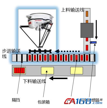 • 通过机器人与伺服系统之间的通信,保证机器人与输送线的同步运动,实现机器人对产品的跟踪抓取。