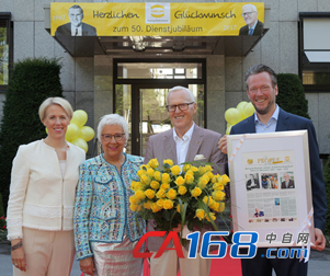 上海, 2017年7月20日 --- 一个惊喜被成功策划。为了庆祝董事会成员 洪狄马先生(Dietmar Harting)的五十周年任职纪念,浩亭员工一早便铺设了从他的泊车处一直延伸到浩亭技术集团办公室的红地毯,并准备了大型横幅,为他们的这位资深领导人带来惊喜。此外,所有在场人员向洪狄马先生(Dietmar Harting)表示祝贺并准备了别具一格的惊喜,而50年前的同一天正是洪狄马任职这家家族企业的第一天。
