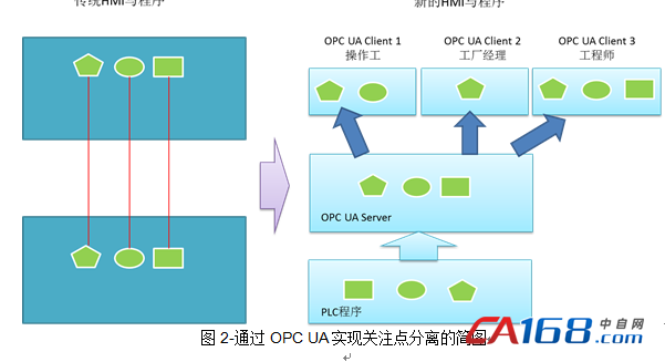 如图2-原有的HMI与程序的绑定造成了无法分离,HMI与PLC程序修改必然会导致对方的修改,而采用图2右侧的架构则可以看出,无论程序和HMI怎么修改,都相互不影响,HMI仅访问标准格式下的数据对象,而对于程序而言,也仅需往OPC UA服务器的地址空间按标准写数据即可。