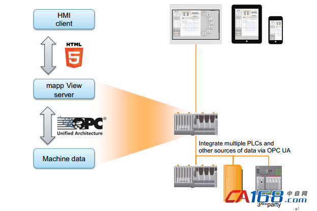 如图3所示,mapp View是在PLC上集成OPC UA Server,然后由支持HTML5、Javascript、CSS的终端来访问,例如iPhone、iPAD、Andriod平台的智能手机,支持各种浏览器例如:IE、Google的Chrome、Apple的Safari等,包括Automation Panel、Power Panel T系列等贝加莱自主的HMI产品,均可访问控制器(PLC/PC均可)。