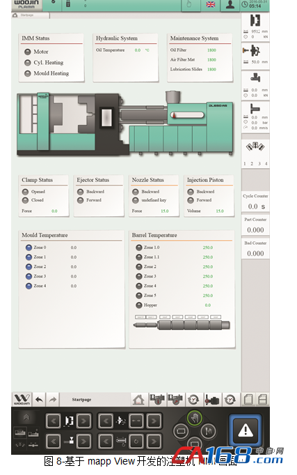 基于mapp View开发的韩国Woojin的注塑机HMI画面,采用了精致的基于Web风格的画面,并采用了OPC UA来访问控制器的模式,可以实现非常便利的画面适应力。
