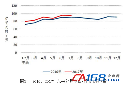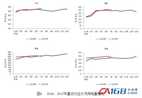 7月份,四大高载能行业用电量合计1579亿千瓦时,同比增长4.6%,增速比上年同期提高4.0个百分点,占全社会用电量的比重为26.0%。其中,化工行业用电量384亿千瓦时,同比增长5.7%,增速比上年同期提高4.8个百分点;建材行业用电量305亿千瓦时,同比增长5.9%,增速比上年同期提高0.7个百分点;黑色金属行业用电量418亿千瓦时,同比增长1.3%,增速比上年同期提高5.9个百分点;有色金属冶炼行业473亿千瓦时,同比增长5.9%,增速比上年同期提高3.5个百分点。