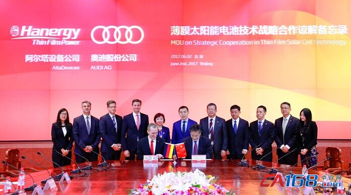今日,汉能宣布集团旗下美国全资子公司阿尔塔设备公司(Alta Devices)与奥迪股份公司签订薄膜太阳能电池技术战略合作备忘录。双方将合作开展“奥迪/汉能薄膜太阳能电池研发项目”。