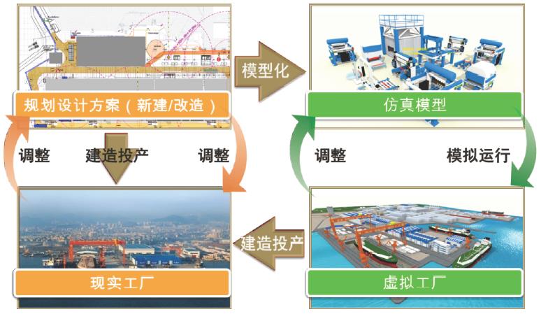 采用数字工厂技术改进工厂建设模式,可有效破解传统工厂建设模式中的技术难题。这些难题往往在建设过程中甚至试制生产过程中才被发现并进行修正和调整,从而带来高风险高成本。在规划设计和技术改造设计阶段,场地利用是否最大化、设备配置是否合理、各工位、生产线人员配置是否合理、物流设施和物流路径是否合理调配、生产节拍是否均衡、生产班次安排的合理性、多生产模式的有效性推演、工厂预设产能是否能够有效达成、空间域和时间域的系统干涉校验等复杂系统问题都可以通过建立虚拟工厂,并通过生产系统仿真来进行计算分析和模拟运行。以优化目标为导向,通过资源调整和虚拟仿真优化,输出理想的工厂建设和实施方案。利用数字工厂技术输出的方案进行工厂建设和实施,可以从源头消除很多潜在的问题,大大降低工厂建设过程中的修正调整成本,有效保障建设工期和建设质量。利用数字工厂技术实现工厂规划建设的建设模式参见图2。