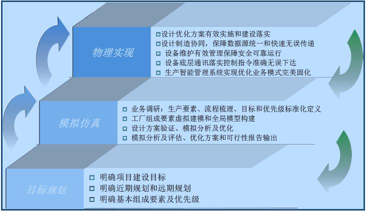 数字工厂的规划建设和投产运营及优化改进是企业两化融合不断深入的过程。在这个过程中,虚拟工厂与物理工厂不断迭代,支持企业生产制造资源系统优化和管理提升中各环节PDCA 循环得到闭环改进和提升。不管是规划建设开始阶段还是投产运营过程中技术改造,优化项目都会预设项目建设目标和阶段计划,定义清晰资源要素的类型、数量和优先级,然后通过虚拟工厂技术针对设计方案进行仿真、分析、验证,并在模拟分析的基础上进行优化和完善。在模拟分析的基础上,项目建设单位针对设计优化方案进行有效实施和建设落实。在工厂运营中实现设计制造协同,保障数据源统一和快速无误地传递。设备的适度、有效维护管理可保障生产制造系统的安全可靠运行。同时,有效的设备互联和底层通讯实现可以保证控制指令准确无误的下达。物理工厂技术旨在提供支持智能制造的生产管理系统,以实现优化业务模式的完美固化。