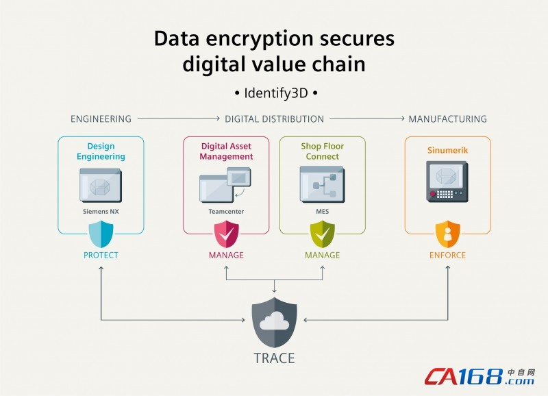 保护设计及制造数据从而保护知识产权免遭盗用的全新可能性包括多个要素,其中一个关键要素是制造可重复性。在CNC(计算机化数控)数据加密和解密中,许可制度将确保部件按照工程规范精确生产,被授权解密的那些组件和实体是被精确定义过的。此外,程序开发人员也可限制第三方服务提供商生产的部件数量,这可以有效防止发生知识产权盗用。用于生产产品组件的制造机器以及所使用的生产材料都会被精确定义。从NX加密的数据上传至一个文件系统,如Teamcenter,并可由此传送至ShopFloorConnect、西门子MES(制造执行系统)及类似解决方案。