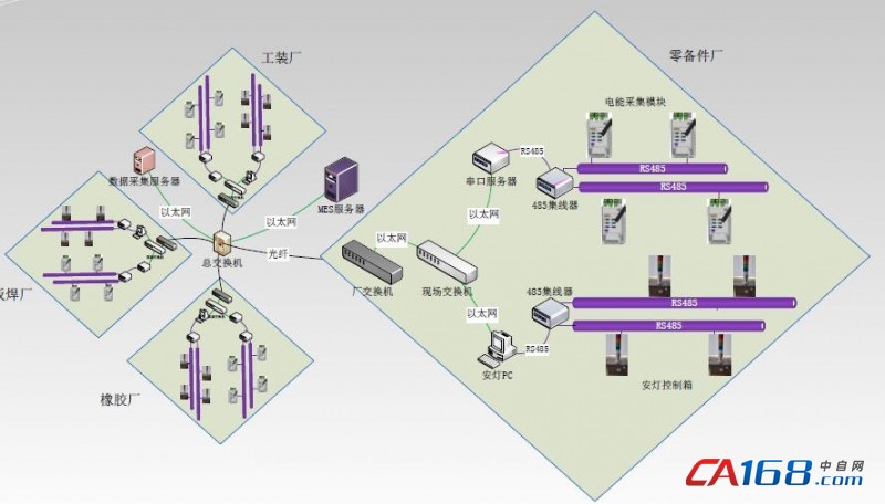 工厂设备数据采用加装电能表进行电能采集,采集到的数据通过RS485现场总线,将数据汇总到串口服务器,再通过串口服务器将数据由高速以太网传输到数据采集服务器。完成现场电能数据快速采集。