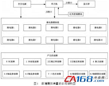 为了让数控机床故障模拟装置设置故障时方便快捷,并且能够为数控装置提供实时性的反馈信号,故障模拟装置核心是由开关电源、单片机、继电器模块组、控制电路及控制程序组成;首先由开关电源给单片机及继电器模块组供电,单片机经编程,控制继电器模块组的工作,利用继电器模块组的触点来实现对主电路、控制电路及I/O点信号的通断控制,来实现对机床中各个部分故障的设置。开关电源通过线路与单片机和继电器模块组连接,单片机和显示屏通过J1接口连接,单片机通过J2接口与继电器模块组连接,继电器模块组与控制电路连接,控制数控机床上的数控系统启停、冷却泵电机运动、主轴电机正反转、换刀动作、X轴返参运动、Z轴返参运动、三色灯指示、X轴超程硬限位报警、Z轴超程硬限位报警等。