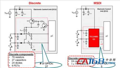 像TIC10024-Q1和TIC12400-Q1这样的器件可以减少120个分立元件;见图2。