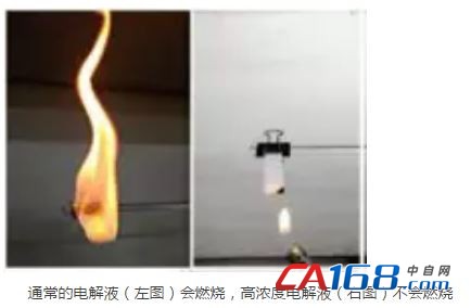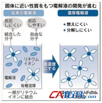 横滨国立大学渡边正义教授认为:“通过使电解液变浓,就会变成接近固体的性质。”它像固体一样不挥发,同时具有不易燃烧的特征,这不正是我们希望得到的高安全电池吗?渡边教授等人开发成功了相当于目前电解液浓度约3倍的高浓度电解液。